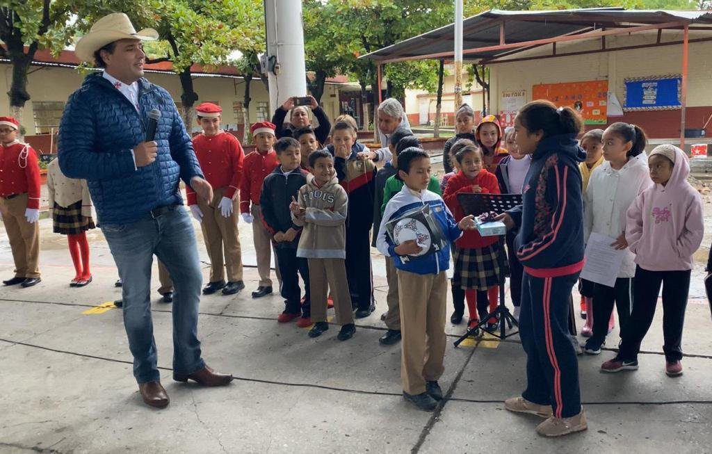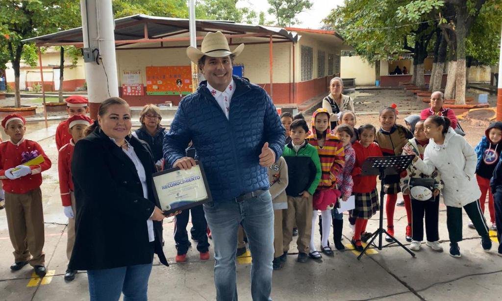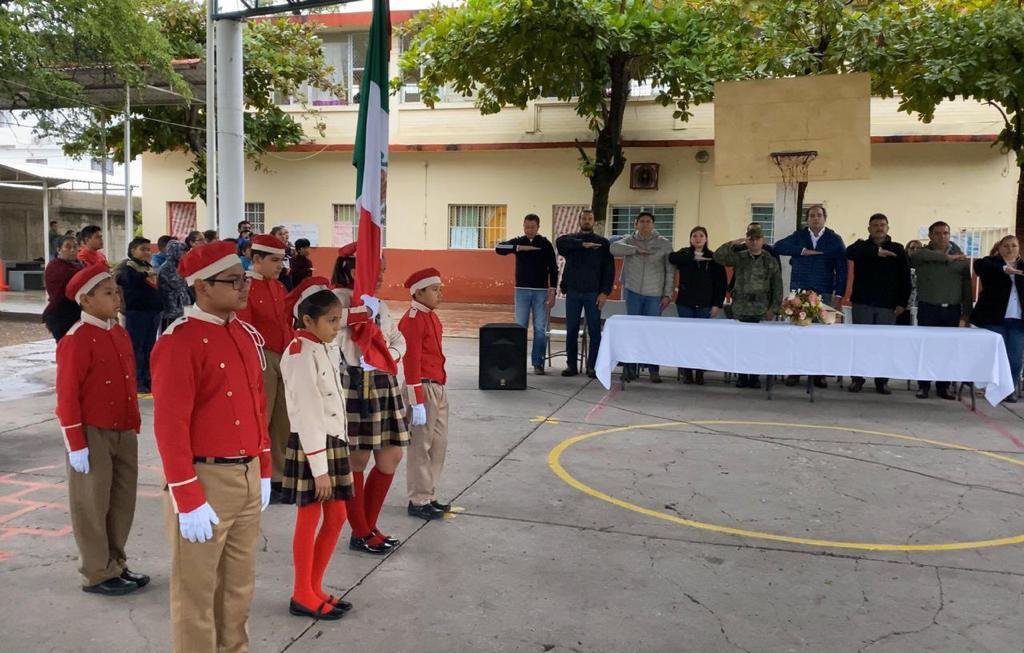 Durante los honores a los símbolos patrios que se llevaron a cabo en la escuela primaria Salvador Varela, el alcalde independiente Adrián Esper Cárdenas anunció que donará su salario a esta institución educativa, para la remodelación de una cancha deportiva.