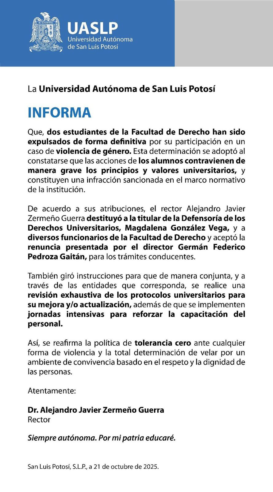 De acuerdo con el comunicado, los alumnos implicados en el caso de violencia de género fueron dados de baja de manera definitiva, al igual que algunos funcionarios señalados en las denuncias.