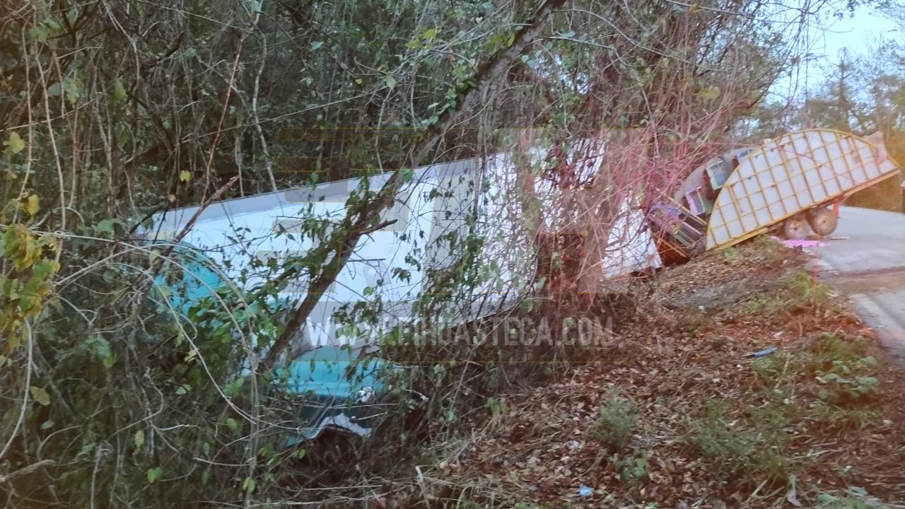 Aquismón, S.L.P. – Un aparatoso accidente se registró en el kilómetro 21 de la carretera federal Ciudad Valles–Río Verde, a la altura de la localidad Santa Anita, en el municipio de Aquismón, donde un tráiler que transportaba una caja y un remolque terminó fuera del camino tras impactar contra la banda de contención.